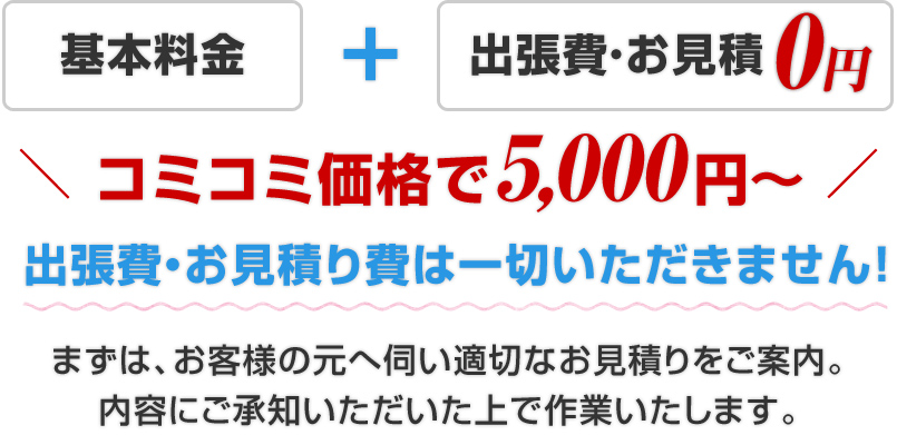 下記は一例となります。詳しくは現場スタッフがお伺いをして状況を確認義、見積り提示いたします。出張・お見積りは無料です。キャンセル料ももちろん発生いたしません。